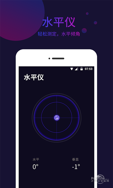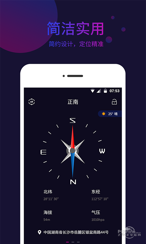 1、指南针-快速显示当前的详细地理位置、经纬度、海拔高度、水平倾斜程度,测量方便.
