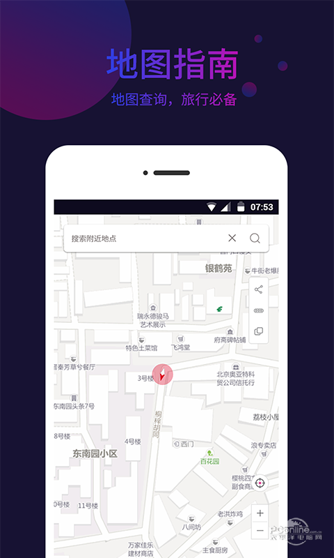 3、地图模式-GPS快速定位,准确显示周边信息,能够同时替您解决方向及导航问题,带您轻松前往目的地.