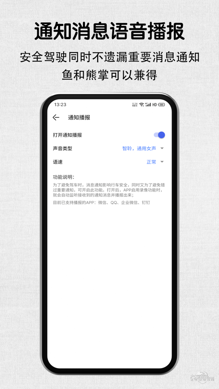 ★ 语音通知播报:行车记录期间,自动播报收到的通知消息,保证安全驾驶;
