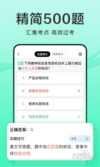 驾考一点通app同步驾考科目一、科目四官方题库,紧随驾考新规要求,截止目前,科目一共1425题,科目四1236题,另有上海、武汉等地方新题。特邀资深专家对驾考题库进行科学分类整理,根据章节、顺序、随机练习多种模式,驾考一点通app帮助学员用最短时间理解并牢记题库。
