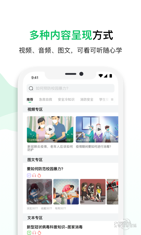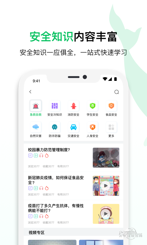 学习的方式可以是看文章、听音频、看视频,满足各种场景和习惯的需求,目前平台的内容涵盖了急救自救、安全冷知识、消防安全、学生安全、食品安全、自然灾害、防诈防骗、交通安全、人身安全、防疫安全等跟我们生活息息相关的安全知识.