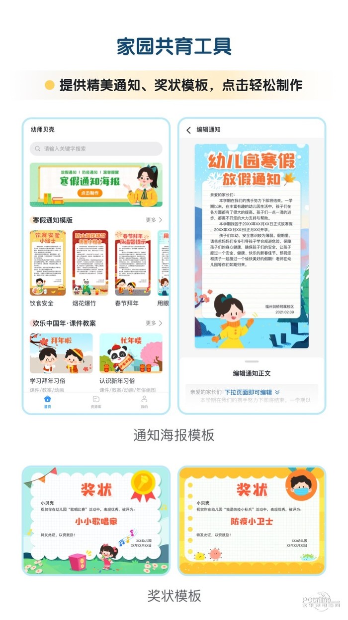 2、海量电子素材:海量高清精品图谱,环创手工、纸面教具、调查表、海报、奖状、手指操、动画、古诗等素材,助力老师轻松备课;
