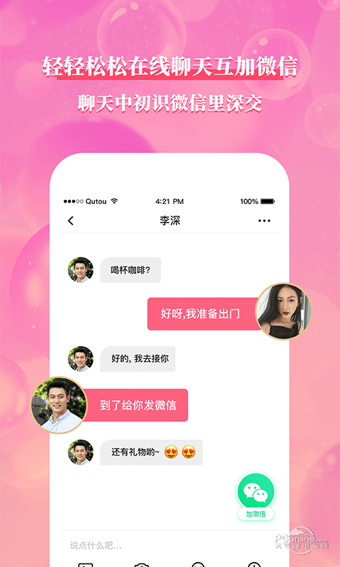 3.在线聊天互加微信:在铂金婚恋上聊天初识,互相添加微信后进行深交