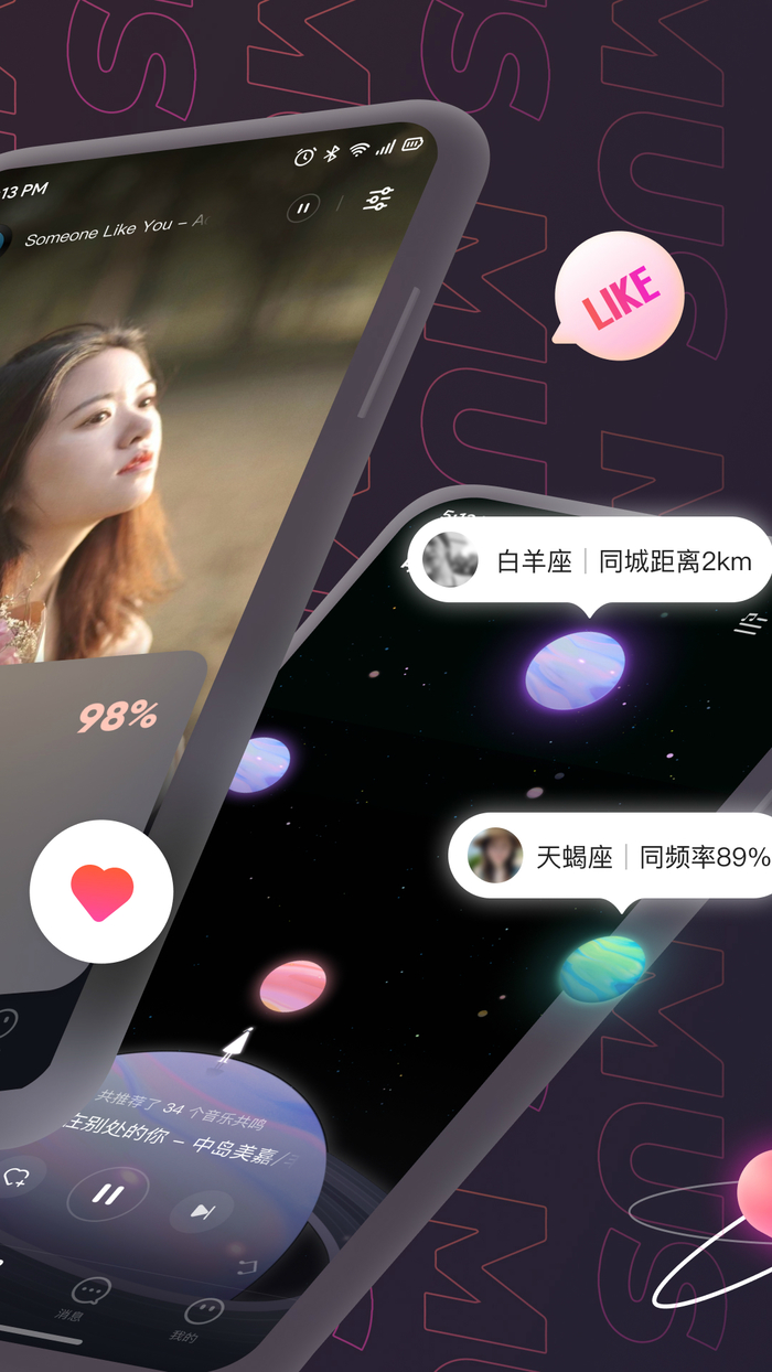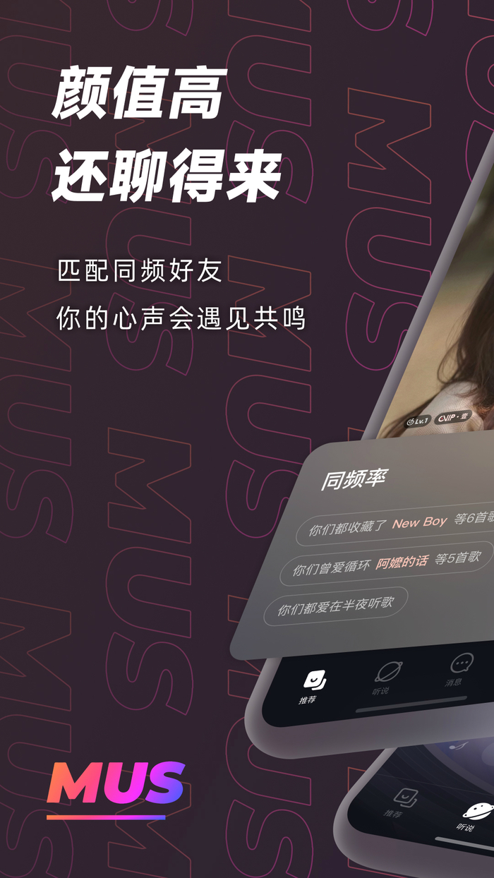 MUS APP,帮助你通过音乐认识灵魂契合的好朋友。通过你的听歌数据解析你的性格和偏好,为你精准匹配同频共振的人。