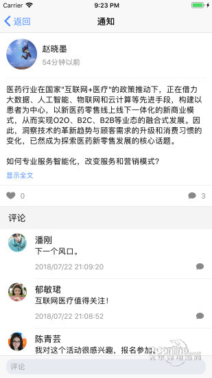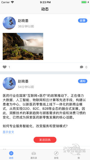 动态:查看最新的通知、故事等,支持点赞和评论;