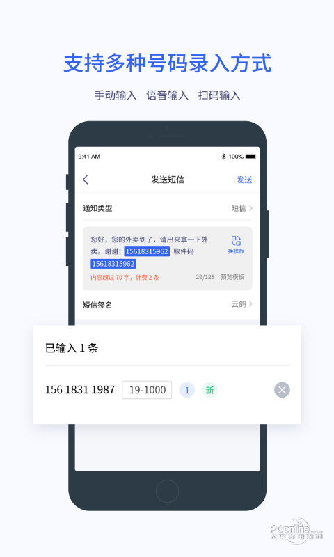 3、【多种方式录入号码】支持扫描快递单、语音录入,手动输入等多种方式录入手机号