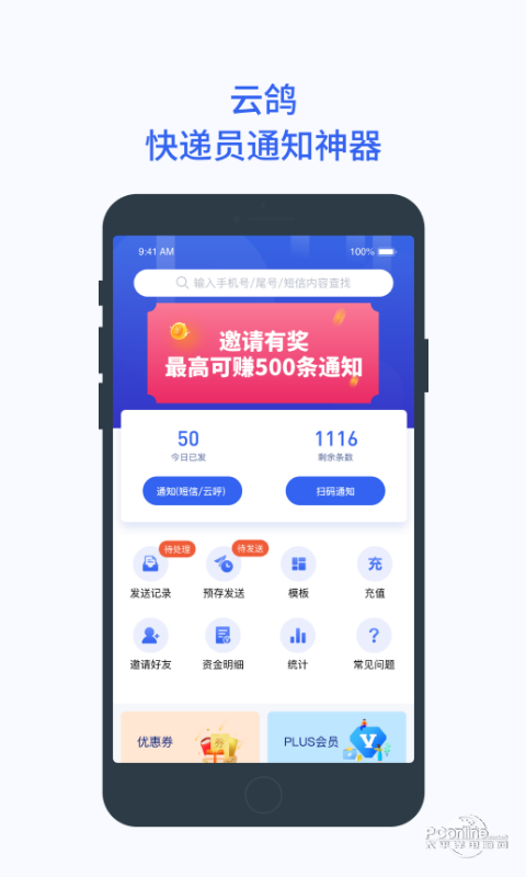 云鸽通知神器是一款高效派件APP,提供一键群发取件信息,一键呼叫用户取单等功能.作为中国领先的物流快递信息服务商,云鸽以物流快递行业为基点,帮助快递员、快递网点、快递驿站等提高派件效率、降低运营成本,是快递员的省时省钱神器和派件得力助手.
