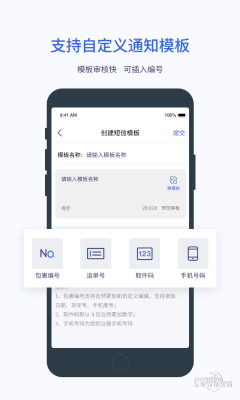 5、【自定义签名】支持以顺丰快递、菜鸟驿站、申通快递、圆通快递、韵达快递、中通快递、百世快递、天天快递、邮政快递等数十家快递公司名义发送取件通知