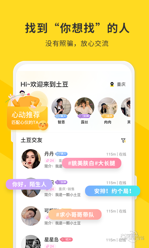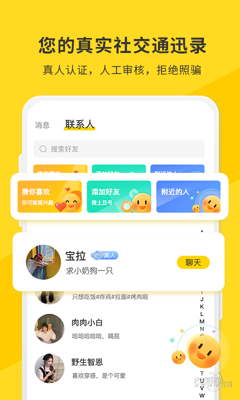 土豆聊天是一款开放式移动社交聊天应用.新版本做了全方面的更新,增加了用户真人认证,豆圈生活展示,同城活动组队缴约报名,个人相册真人标签展示,相册权限置.