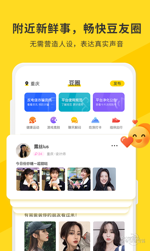 发布个人生活动态;广播出行、运动、游戏等节目,清晰的在身边人海中找到相同兴趣的伙伴;
