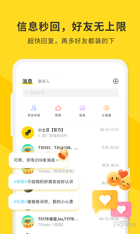 每个真人认证用户可拥有上限10万的联系人管理列表,还可以与兴趣相同的好友创建群讨论组一起聊天,系统也会根据你的个人资料兴趣标签推荐猜你喜欢用户结识;