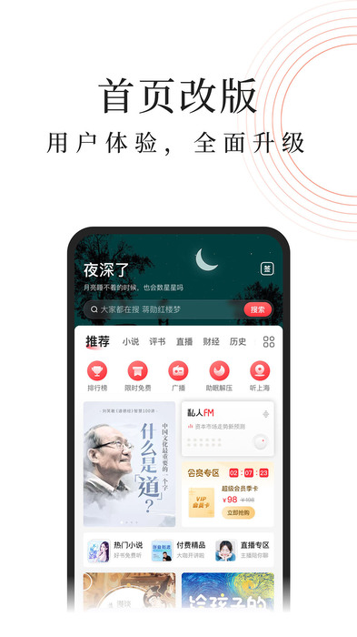更新版本说明:1.首页信息流推荐增加节目聚合听单大卡片,想听的节目一网打尽! 2.423听书节活动上线,超级会员买1得7,机会难得,赶快来~