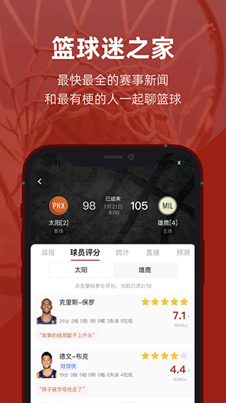 4.篮球:nba,CBA直播、实时新闻、趣味猜测、数据统计,直观展示球员投篮分布图、投篮热图、臂展数据。
