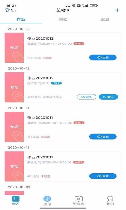 3.根据作业提供不同的学习类别栏.有三种不同的练习方法:测试和大厅测试;