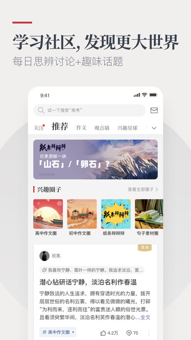 纸条app优势1、不仅是高效提分的写作大佬,还培养社区:在圈子里,与成千上万的同龄人交换有价值的想法,学会多角度批判性思维,并将这种能力带到未来的文章写作中。