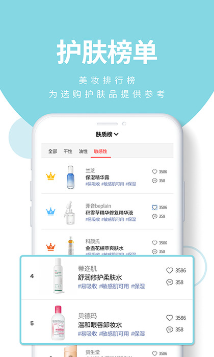 2、是一款掌上美容护肤社区,提供肌肤测试、搜索查询、社区、护肤排行榜等多个频道,供您选择。