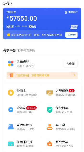 2、现金服务:取现,乐花,万元现金5秒到账银行卡。