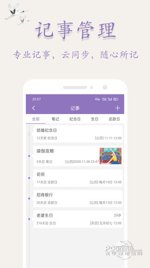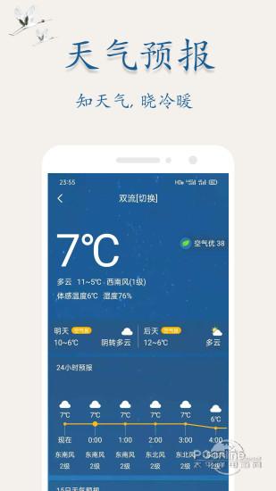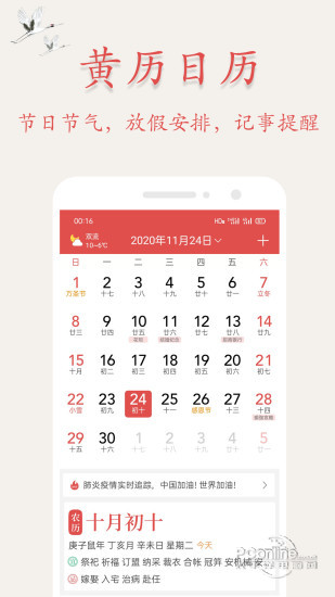 万年历、日历、农历、黄历、阴历、周公解梦、天气预报、记事、倒数日、记事提醒便捷查看,一目了然!【产品简介】(1)日历:公历、农历,放假安排,传统节日和二十四节气日期标注提醒,更有详细的节日、节气科普介绍;(2)黄历:拥有完整的老黄历信息,详细罗列出农历节气变化,每日宜忌,吉神凶神,天干五行,同时显示公历、农历等多套历法;(3)周公解梦:帮助您快速了解自己的梦境;(4)记事提醒:拥有完善的提醒功能,操作简单快捷,包含笔记、生日、纪念日、还款日提醒等,随时随地提醒重要事项,让生活变得井井有条;(5)桌面插件:可以在桌面快速阅览农历、天气、节日信息及记事提醒;(6)日期计算:快捷方便的计算日期(公历、农历)间隔; 【产品特点】(1)专业时间管理工具,丰富的记录方式,满足你多种场景下的个性需求;多样的自定义功能,让你随心设置;(2)界面清爽,主题、皮肤自定义,操作简单,重要信息一目了然;(3)全方位生活信息,天气预报、车辆限行、星座运势、黄历宜忌;(4)微信、QQ一键登录,换手机也不会丢失记事、提醒信息;