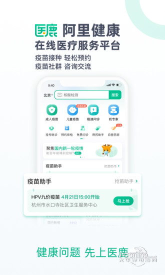 阿里健康全新升级为医鹿,为您提供可信赖的在线医疗服务。儿童及成年人疫苗贴心推荐,接种提醒守护全家健康,HPV9价/4价在线抢苗,新冠/流感等成年人疫苗在线预约,宝宝打针,提前预约不排队,疫苗百科查询,医生审校权威认证。1元义诊全面上线,1元问诊全科疾病,权威医生专业解答。全面为用户提供7*24小时在线极速问诊、三甲好医生咨询、便捷本地医院等服务,汇集海量名医权威信息,还能体验挂号&体检&购药等健康管理一站式生活服务,是全家的健康助手。【疫苗预约】提供儿童/成年人一站式疫苗服务,为您约到全家人的苗【特惠义诊】千名医生1元问诊【极速问诊】7*24小时实时问诊