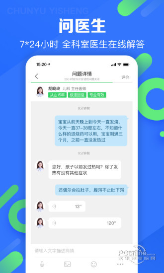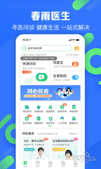 来春雨医生,守护全家人的健康——让孩子健康成长,让老人健康养老,让家庭成为真正的健康港湾,为中国人造一个健康家。 【快速问诊】宝宝发烧,脸上长痘,化验单看不懂,7×24小时全科室真实临床医生线上接诊专业解答,3分钟内响应【找医生】全国60万+医生专家荟萃,电话咨询、线下就诊,找到更适合你的好医生【在家购药】上千种常用药、专科药,咨询开方,一键下单送药上门。更贴心精选日用保健、母婴护肤、疫苗体检等健康好物,全方位呵护家人健康【健康+】实用健康工具,科学健康计划,超全面健康档案,智能设备便捷记录,专业健康顾问指导,搞定你的健康小问题【特色服务】三高失眠怎么办,新手妈妈好焦虑,宝宝挑食不吃饭……在这里都能找到一站式医疗健康解决方案【春雨证在测】新生儿枕头怎么选?口服玻尿酸,真美白还是智商税?......一档“满世界找科学证据”的健康测评栏目,立足科学循证,帮你检测真伪 [联系我们] 官网://www.chunyuyisheng.com 微信公众号:springraindoctor 意见反馈:feedback@chunyu.me