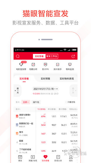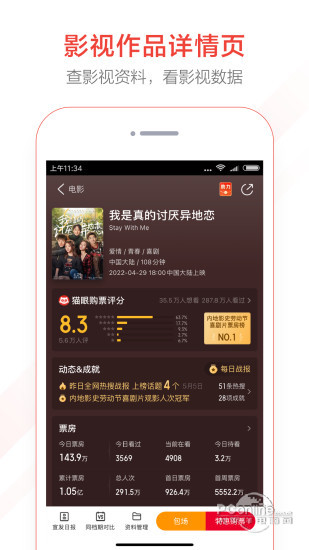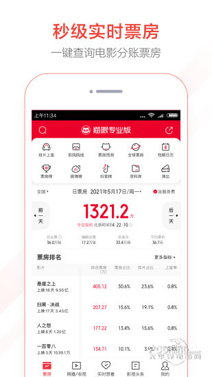 猫眼专业版,由猫眼电影出品,为影视行业从业者提供及时、准确、专业的电影票房数据分析(秒级实时票房,排片,影院经营数据等),网络平台播放量,实时电视收视数据等,为影视从业者提供信息互通平台,提高影视作品制作效率(剧组成员招募,行业精英对接,找剧组、投资、导演、演员、摄影等)。 主要功能: 主要功能: 1.秒级实时票房:国内首款秒级实时票房查询工具,每分每秒掌握电影市场实时动态; 2.网络播放量:各大视频平台网播内容播放量监控; 3.实时电视收视:实时关注度,实时市占率,等电视收视数据; 4.票房预测+猫眼指数:洞察电影吸金潜力,提前把握影市脉搏; 5.排片&上座率:国内最超前的排片查询工具,提前一个月查询热门档期排片,随时掌握各影片排片场次及占比,上座率及场均人次; 6.电影营销+物料投放监控系统:电影营销事件结合影片受众画像,有效量化营销效果,精准定位影片受众,同时监控影片预告等物料投放效果; 7.影片对比:支持任意影片对比,数据表现一览无余; 8.专业电影资料库:影片、影人、公司,制片发行数据信息一网打尽; 9.影院顾客画像:依托美团点评消费大数据库,产出行业最全的顾客与潜在顾客分析,帮助影院经理掌握顾客是谁,顾客在哪,顾客喜欢啥; 10.影院实时票房:更及时,更丰富,定位到影院!帮助影院经理知己知彼,更准确的制定经营决策; 11.找合作:海量剧组入驻,与剧组真实对接,双方直接沟通合作意向,提高影视剧制作效率,业内精英工作档期无缝衔接;更多功能,亟待上线