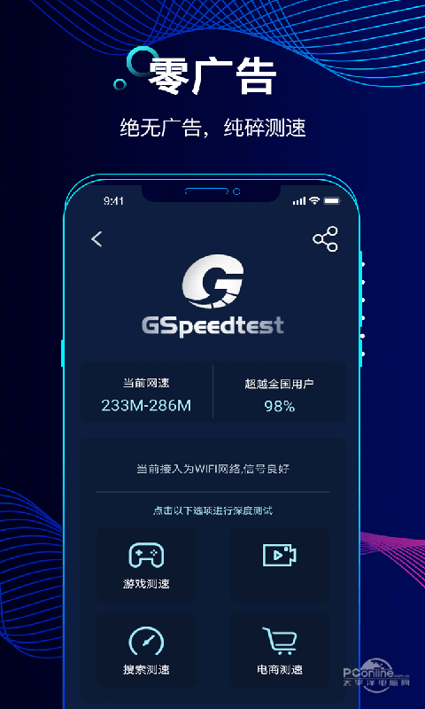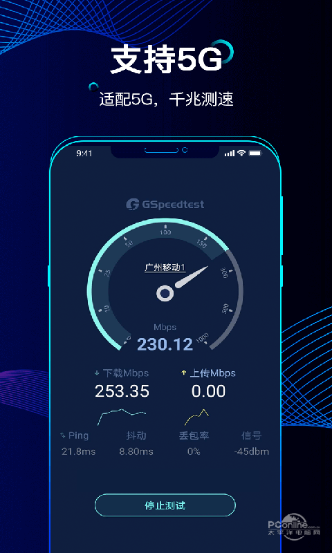 官方首批支持双千兆测速软件,是一款完全按照工信部行业标准开发的专业测网速工具.支持2G/3G/4G/5G网络测速、WiFi网络测速,可以让你随时随地了解自己的网络情况,安装快捷,操作简单,一键测速,测速服务器多,你可以手动选择自己想要的测速服务器进行测试,测试结果清晰明了,结果呈现下载速率、上传速率、Ping时延、抖动、丢包率以及信号的强弱情况.