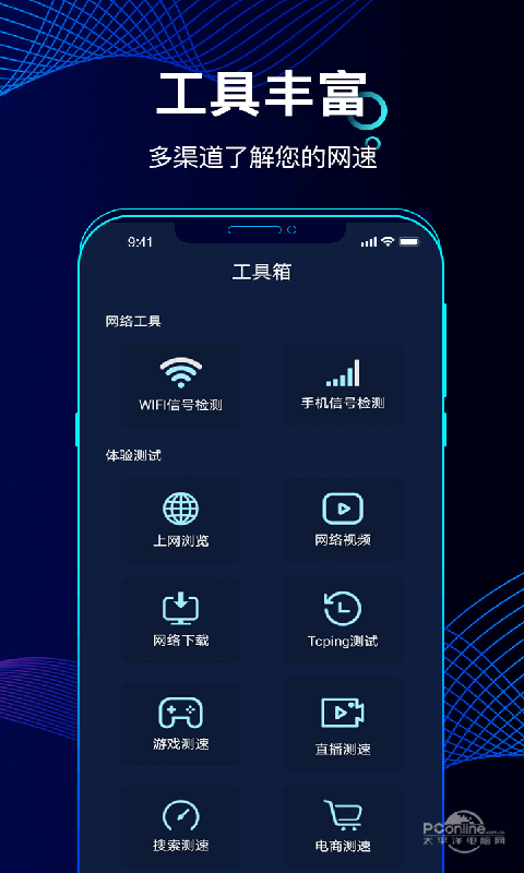 【工具箱】功能丰富,拥有WiFi信号检测、手机信号检测、全屋WiFi检测、上网浏览测速、游戏测速、Tcping测试等功能
