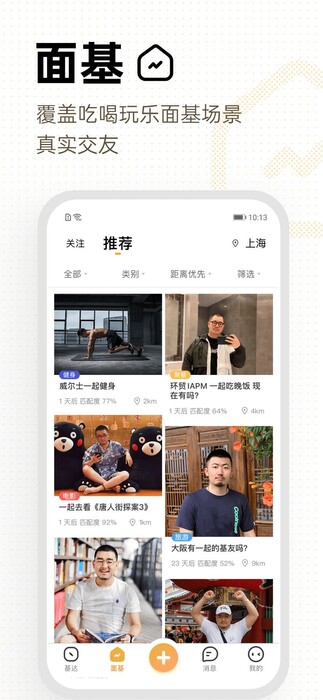 「面基」:成千上万的约会活动都在这里,你可以根据自己的兴趣爱好发起活动寻找趣味相投的基友,也可以你按照兴趣爱好挑选想参加的活动,还可以参加你关注的人发起的活动。