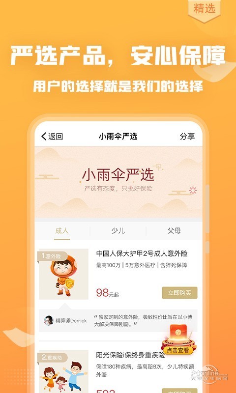 严选保险商城是小雨伞保险经纪有限公司独立研发的保险服务平台,致力于为用户提供优质保险产品及一对一定制咨询服务.