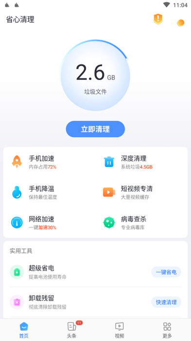 省心清理APP功能1、垃圾清理:更新发动机库,深度清理手机垃圾,释放手机空间。