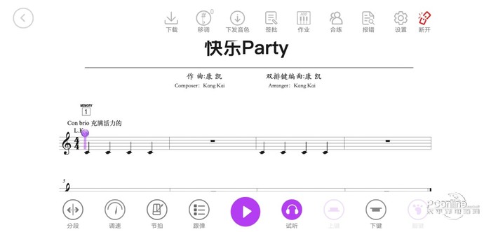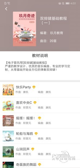 玖月琴房App是一款帮助孩子快速学习双排键的一对一教学工具。该产品拥有丰富的曲库,自动下发乐曲音色,智能纠错,并记录孩子所有的练习记录,多维度跟踪孩子的学习进度,是孩子练琴的好帮手。玖月琴房主要包含以下功能: 1. 曲库:专区分类:按照分类设置不同专区,如:学习专区、考级专区等;乐曲演奏:可选择不同的演奏模式,如:识谱、纠错、跟奏,可自由调速,分手/脚单独练习;作业下发:老师可以选择一首乐曲,设置演奏要求,给学生下发作业。 2. 琴房:老师和学生都可使用琴房功能,分别拥有不同的功能,具体包括:老师:可进行学生管理、课时管理、查看作业;学生:查看作业; 3. 个人中心练习记录:记录每首曲子的所有练习记录,并通过折线图的方式呈现进阶过程;我的收藏:可以将喜欢的曲子都收藏到这里;教师认证:提供老师相关的资料,审核通过就可以成为一对一的双排键老师;我的会员:查看会员信息,并可成为VIP会员;我的卡券:所有的优惠券都在这里;我的课时:可查询课时的充值与扣减记录。
