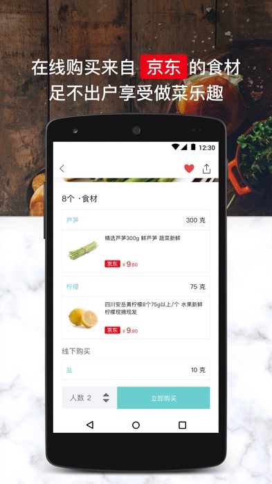 4、一键买齐菜谱食材,支持在软件里购买来自京东的食材。
