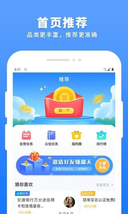 5、全力打造最快最安全的服务活动平台,为我们提供多种任务,让您自由操作赚取收入。
