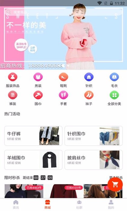 5.拥有丰富的商城类别专区,上面设置了围巾、袜子、手套以及毛衣等多种分类和图标。