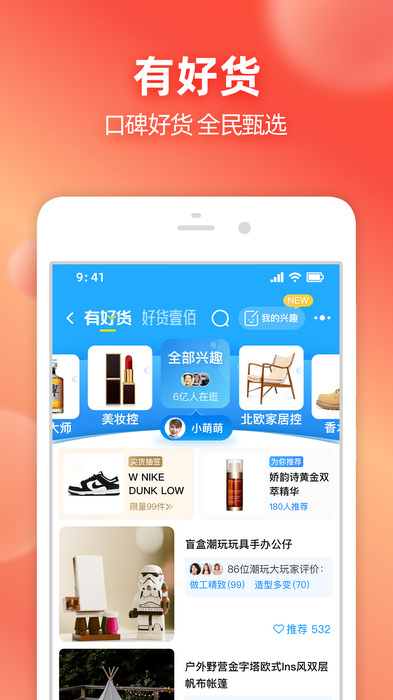 淘宝app免费下载亮点1、省钱:每天更新一万张淘宝天猫商户优惠券,我们的使命是帮你省钱。