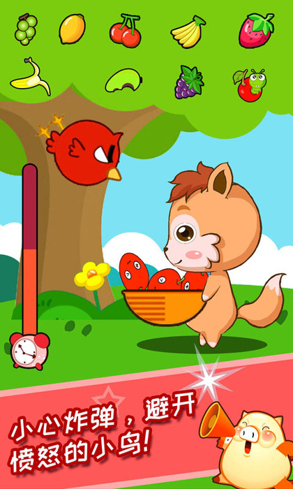 儿童宝宝接水果简介儿童宝宝接水果的方法简单,只需点击屏幕左右移动小松鼠,接住掉下来的果子,即可得到金币。若接到未熟或坏果的小朋友,会扣去相应数量的金币,能让孩子能更好地学习知识,集中训练孩子反应能力,获得更多的金币奖励,体验成就感。
