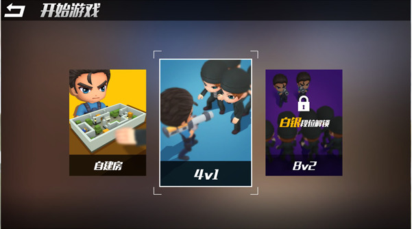 对于新手玩家来说,在达到白银段位之前,只开放“自建房”和“4V1”点击两种模式“4V1”按钮可以进入游戏准备界面。想要体验更多的玩法,可以试着升级哦!