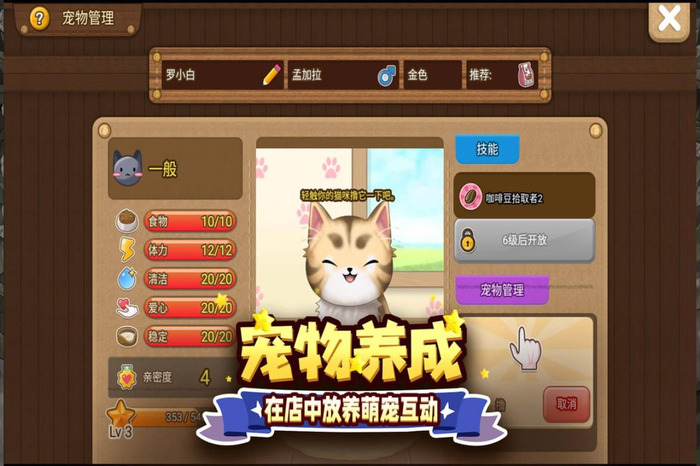 2、需要对自己的猫咖啡馆进行装修、经营、制作各种咖啡,以满足顾客的需求,获得报酬,解锁更多有趣的游戏玩法。
