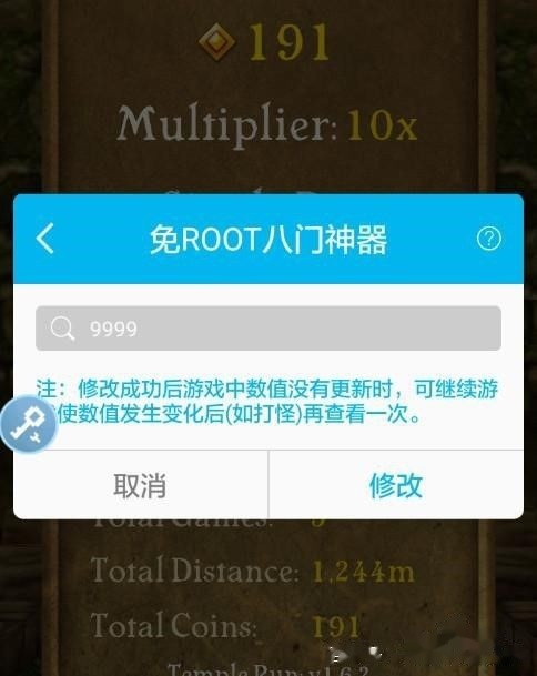 7、进游戏就得到了9999个金币,本次修改大功告成,八门神器什么道具、等级、钻石都可以随意修改哦!