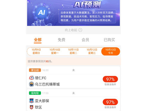 出奇体育app功能1、大数据分析:使用多重维度进行体育赛果预测,帮助球迷进行高效精准的数据分析。