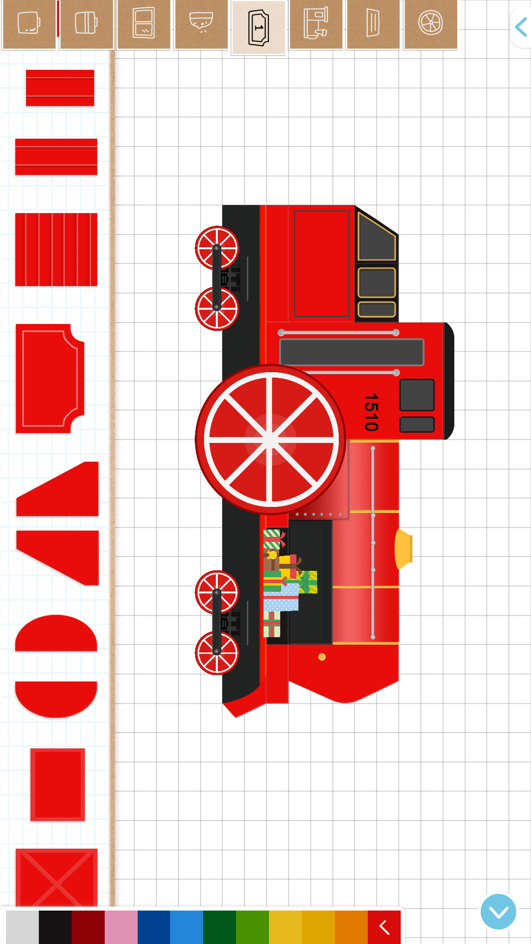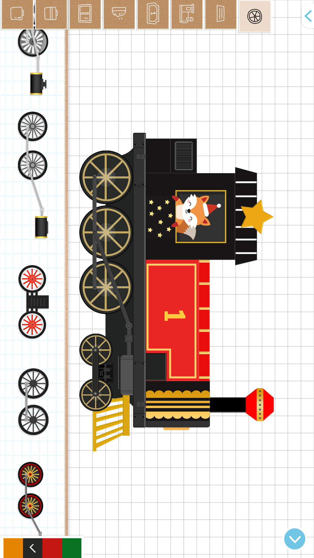 3、提供了大量的多种配色的火车部件、轮子、贴纸和基础形状的积木块,用户可以快速搭建也可以随意发挥。