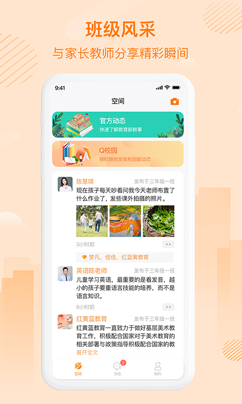 3、【家校互动】班级群聊,好友单聊,实现家校无障碍高效沟通。