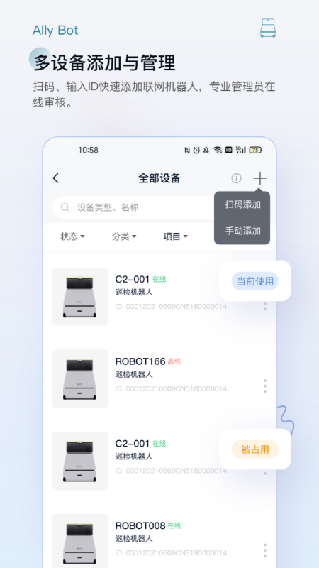 · 多设备添加与管理——扫码、输入SN快速添加联网机器人,专业管理员在线审核。
