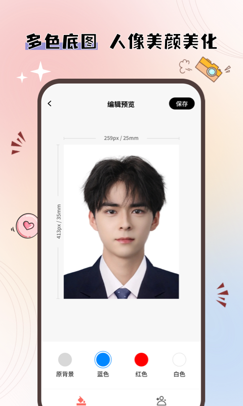 【多种尺寸】 一寸证件照、学生证件照、工作证件照用手机随时随地就能制作!一键更换证件照底色,多种背景色可选!