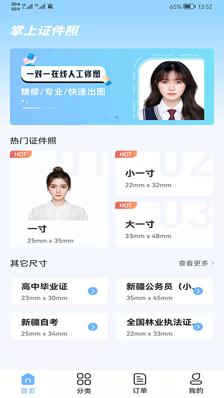【海量尺寸任选,满足多种需求】全球超682+尺寸可选。全程陪伴,满足你在全类场景下各种证照需求首页热门规格直达,支持尺寸/类别搜索,快捷高效触达你所需 ?多类别:商务职场、考试求学、生活证照、旅行签证…. ?多尺寸:1寸、2寸、小一寸、小两寸.... ?多场景:身份证、社保证、驾驶证、四六级、毕业照、公务员、简历照….【自然美妆调整,呈现最美状态】皮肤瑕疵修饰、五官比例修正、双眼放大明亮,整体美颜效果自然又高级通过智能优化技术,对人脸进行智能识别优化: ?过滤脸上的毛孔、黑头,除去脸上的一些黑斑、痘印; ?根据五官比例适当修正,同时美化双眼,使眼睛看起来更大更亮; ?即便光照条件不够充足,美颜效果也能明显提升,效果更加自然。