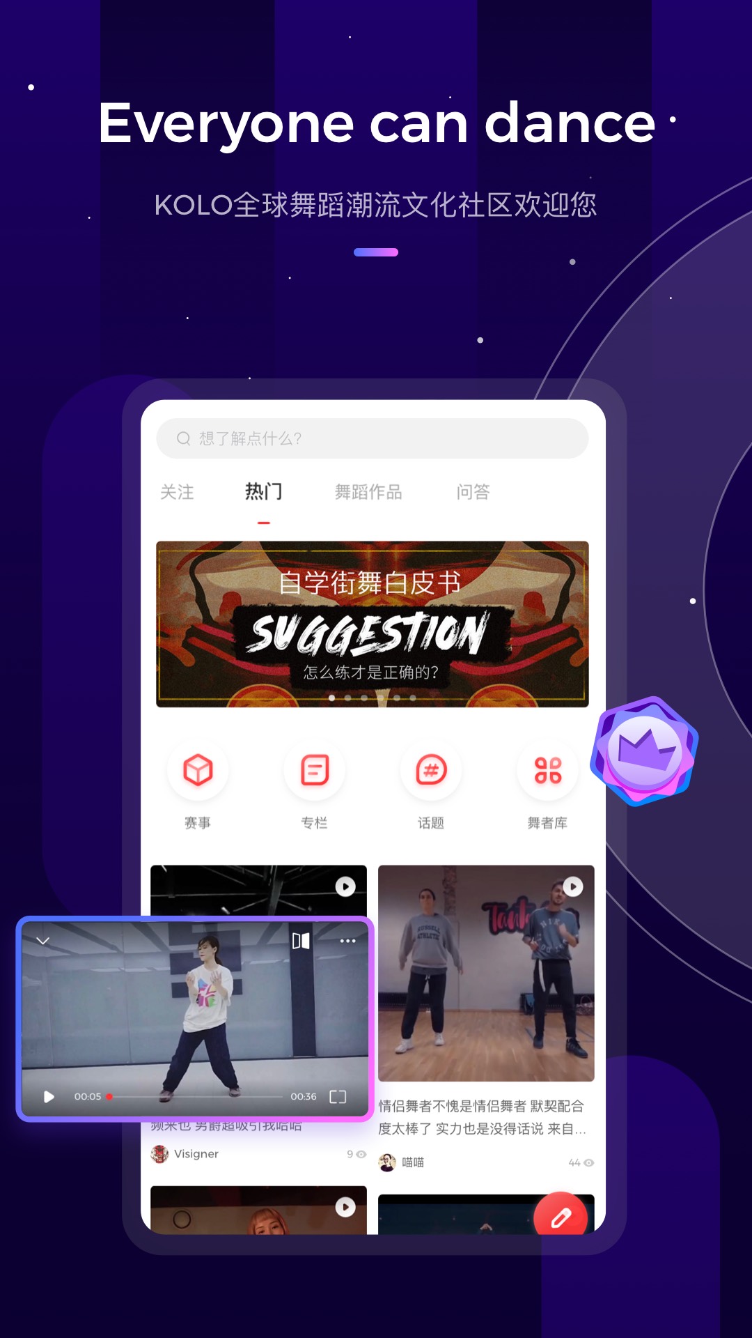Discover Your Rhythm KOLO全球舞蹈潮流文化社区欢迎你! KOLO致力于为全球舞蹈爱好者搭建跨地区跨文化的学习交流平台。聚合优质的视频作品,给你视觉的享受和了解街舞的新方式。 顶尖街舞大师内容首发,一个大师一个舞台,给你原味及时的内容更新。 街舞爱好者潮流圣地,发现更多和你拥有同样生活方式的伙伴,看见你对街舞的热爱,这里的街舞很真实!世界街舞赛事前瞻,Arena舞朝竞技场指定平台。全球顶尖赛事资讯同步分享,热血就在这一刻。财神爷站提供KOLOapp官方版下载地址,有需要的用户可免费下载使用!