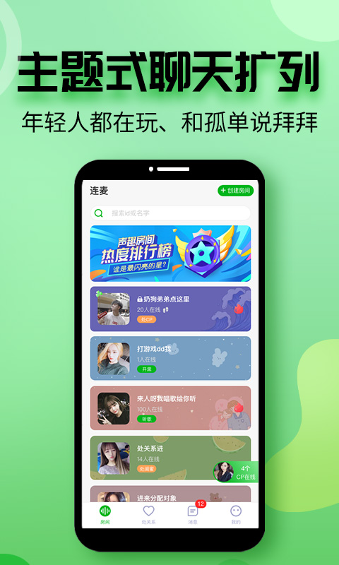 【语音交友】海量在线优质用户,多人语音房,你专属的线上单身派对,用声音魅力展示自己,找到属于你的声音恋人,与有趣的声音在线组CP谈恋爱。【语音房间】 pia戏,相亲交友,情感电台,树洞,在线连麦,暖心陪伴,二次元语音兴趣社交,语音交友房间内在线斗图,是戏精还是快乐崽崽?等你探索~