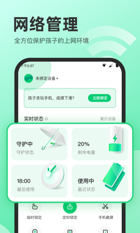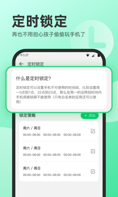【手机锁定】:您可以选择固定时间段或者临时锁定孩子的手机,在孩子的学习、休息时间限制手机使用,防止影响学习及休息,让孩子养成良好的手机使用习惯。