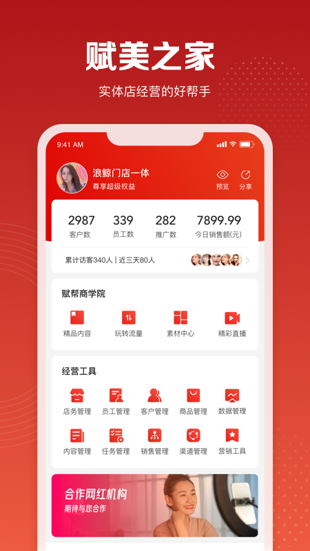 【门店管理】老板/店长可在手机APP上查看经营情况,查员工任务工作完成情况,一键下发任务;员工完成工作自动奖励,实现自动自发工作动力。【客户营销】全自动循环拓、留、锁、升营销系统,让盈利更简单。