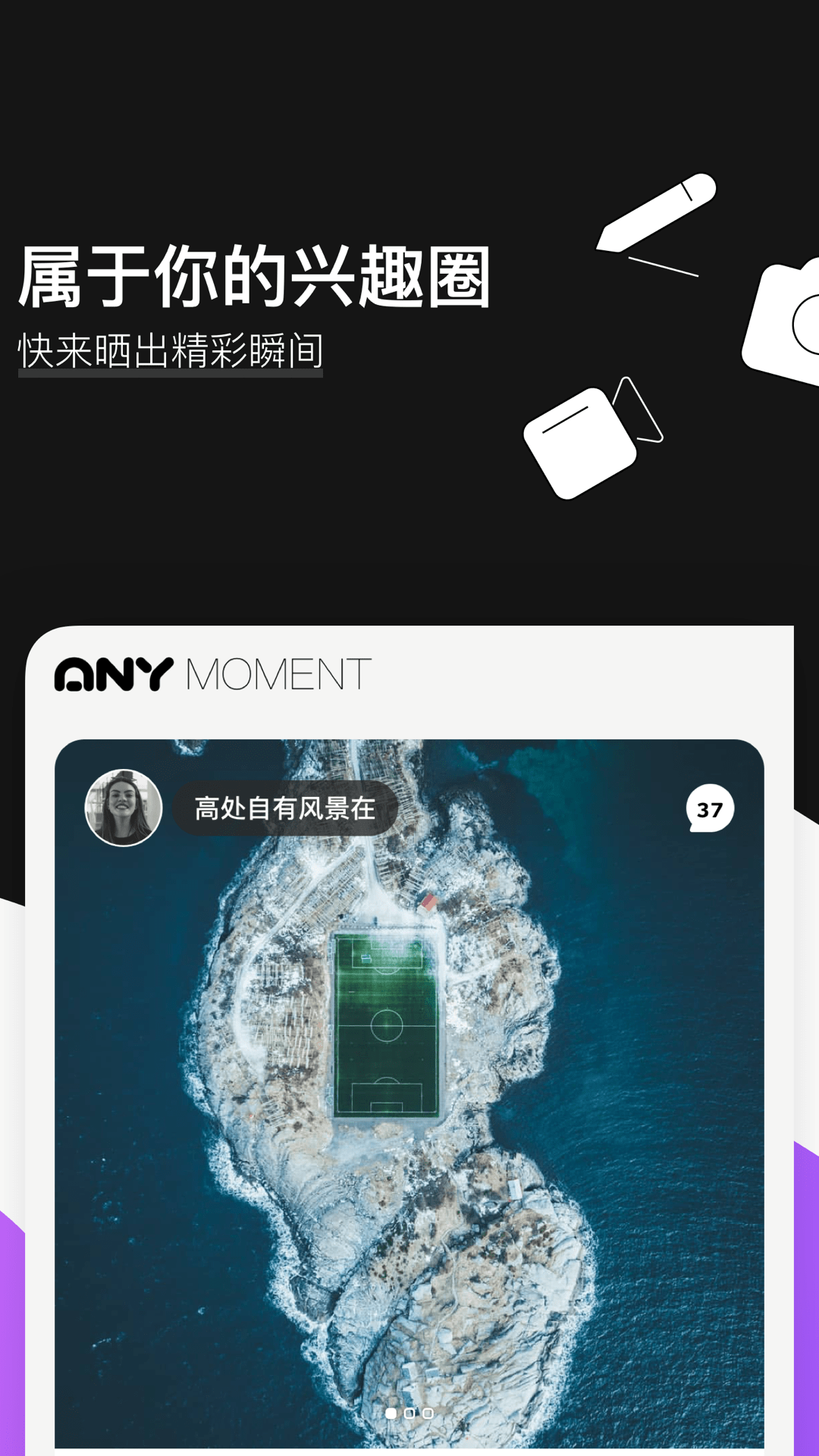 「分享美好瞬间」 照片和视频记录你每一段美好的记忆,让你在生活中发光的那一刻在「Any」里面骄傲地闪光吧。 Any「遇见同兴趣好友」 在互联网的另一端,会有一个跟你一样喜欢旅行,手办,cosplay,极客等各种兴趣爱好的你,正在等待着你一起去发现每一个快乐的瞬间! Any「远离无效社交」 各种各样的社交产品让人眼花缭乱,愿意分享真实兴趣生活的人越来越少了。但在「Any」里面你可以看到所有对美好事物的真实分享记录,让喜欢小众兴趣爱好的你不在小众,不再孤单爱你(Any)更新日志: